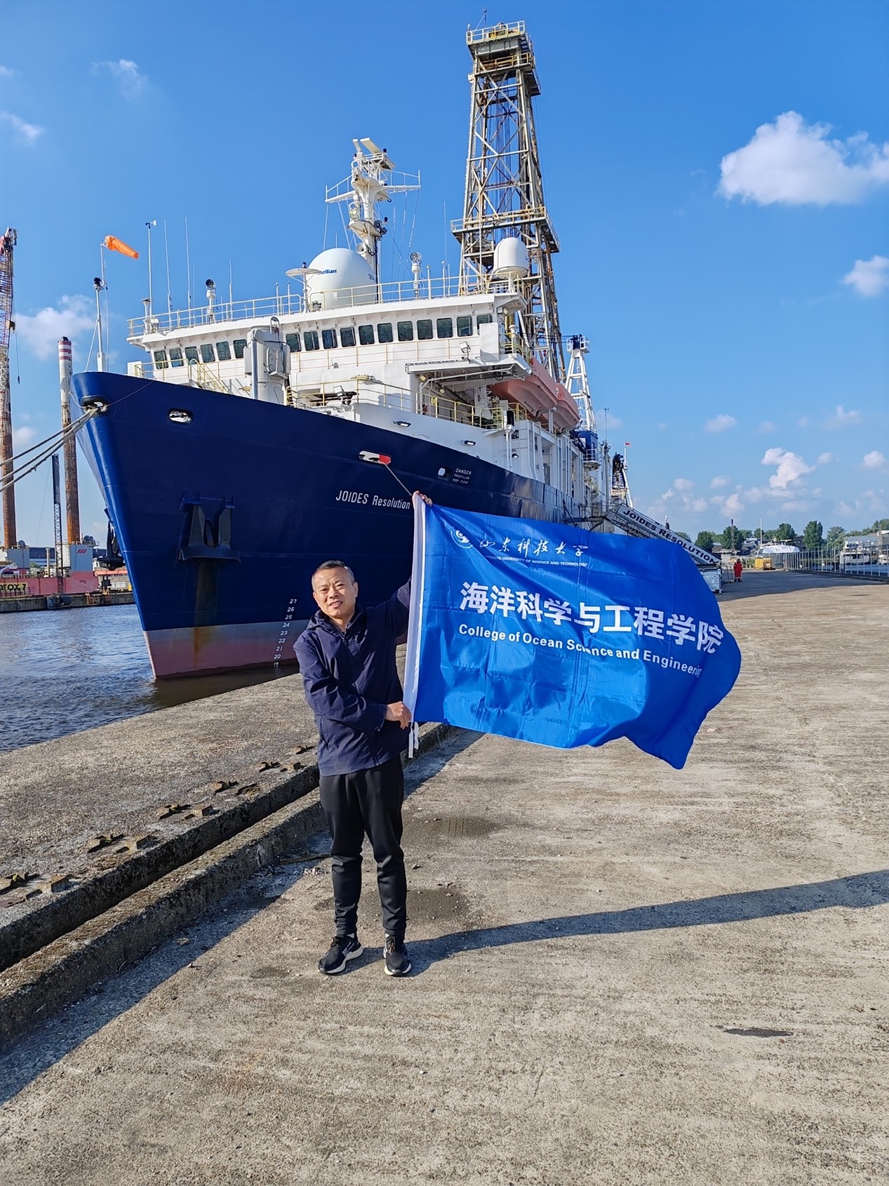 刘焱光在“乔迪斯·决心”号(JOIDES Resolution)大洋钻探船前